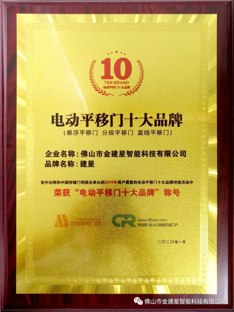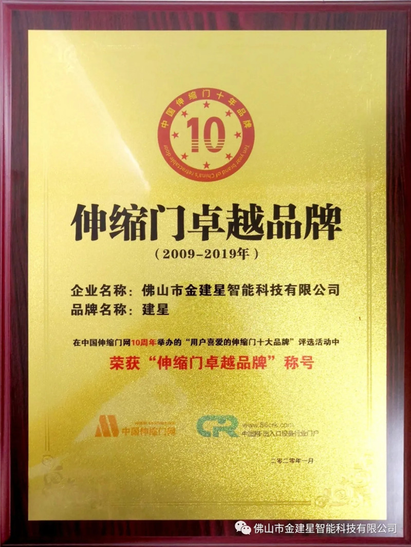 然而“伸縮門(mén)卓越品牌”大獎(jiǎng)的評(píng)選條件是非常嚴(yán)峻的,必須要連續(xù)十年榮獲十大品牌的獎(jiǎng)項(xiàng),在入選的所有企業(yè)中嚴(yán)格評(píng)選出兩家,而建星智能憑借產(chǎn)品過(guò)硬,企業(yè)綜合實(shí)力強(qiáng)等條件脫穎而出,非常榮幸的成為其中一家!
