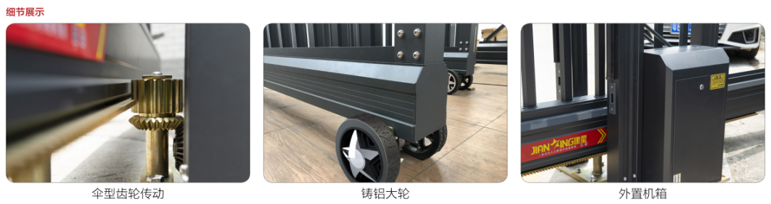 設(shè)有IC無觸點(diǎn)控制系統(tǒng)驅(qū)動(dòng)機(jī)帶紅外線防碰、防爬、磁敏感應(yīng)限位開關(guān) (限位準(zhǔn)確、靈敏) 等安全防范功能;外置式電機(jī)美觀而且安全可靠;門體裝有手動(dòng)離合裝置,停電或檢修時(shí),可打開離合手柄,然后以手動(dòng)方式推拉門。